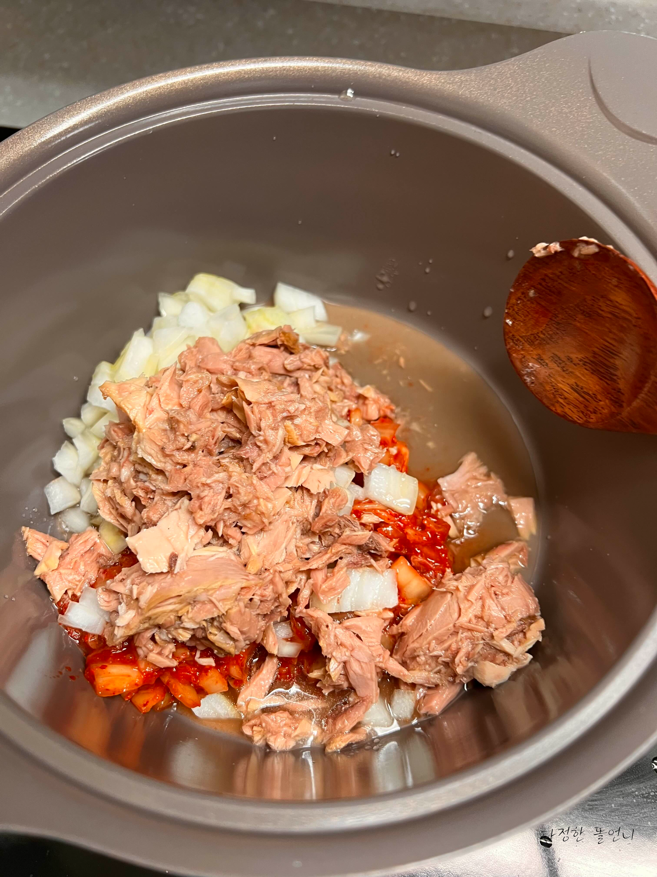 찌개가 아니니까 너무 크지 않은 냄비에 다진양파, 다진김치, 참치 그리고 기름까지