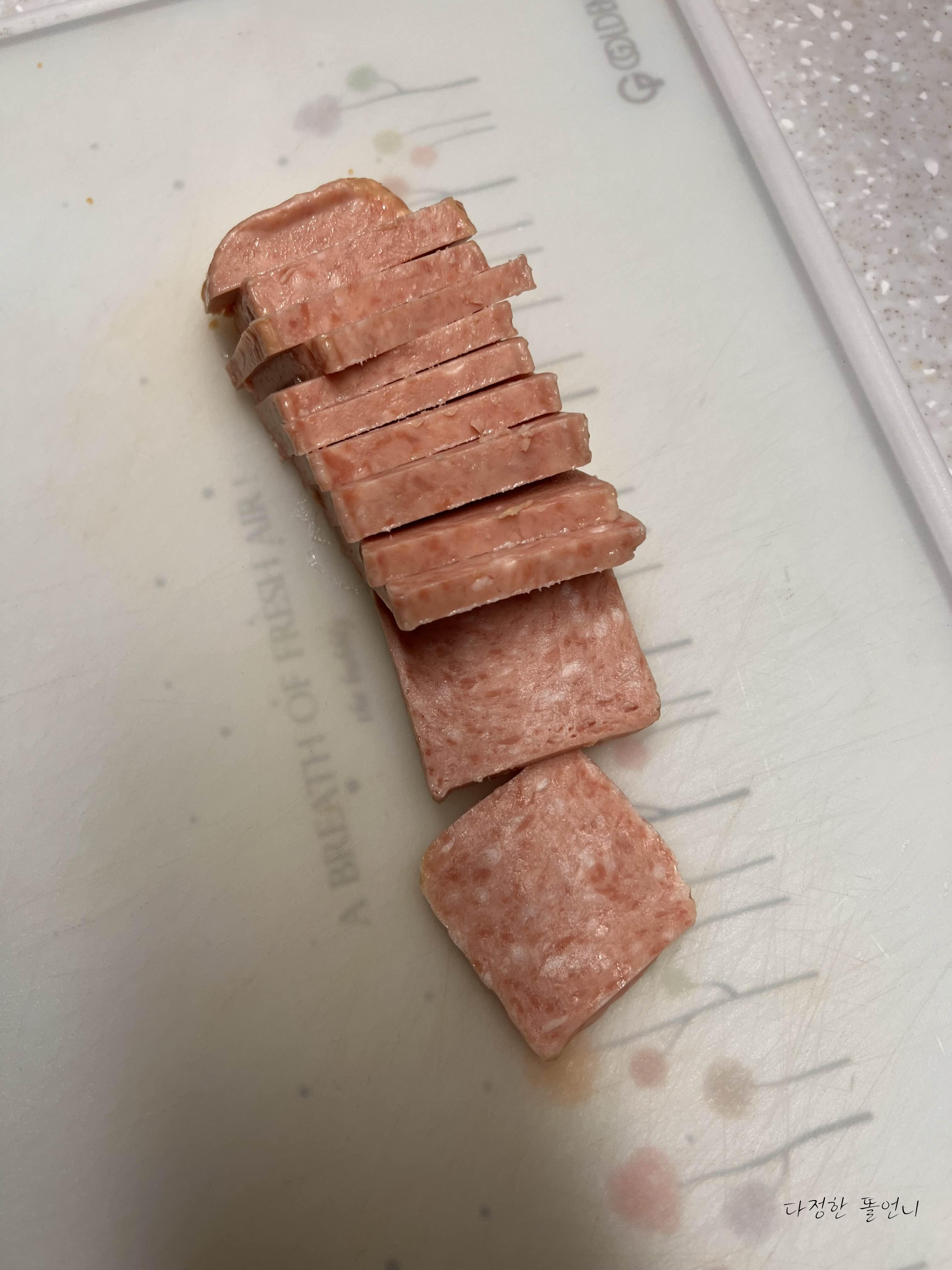 곁들이로 넣을 스팸을 총총 잘라놓고 양파 같은거 있으면 야채도 썰어두세요