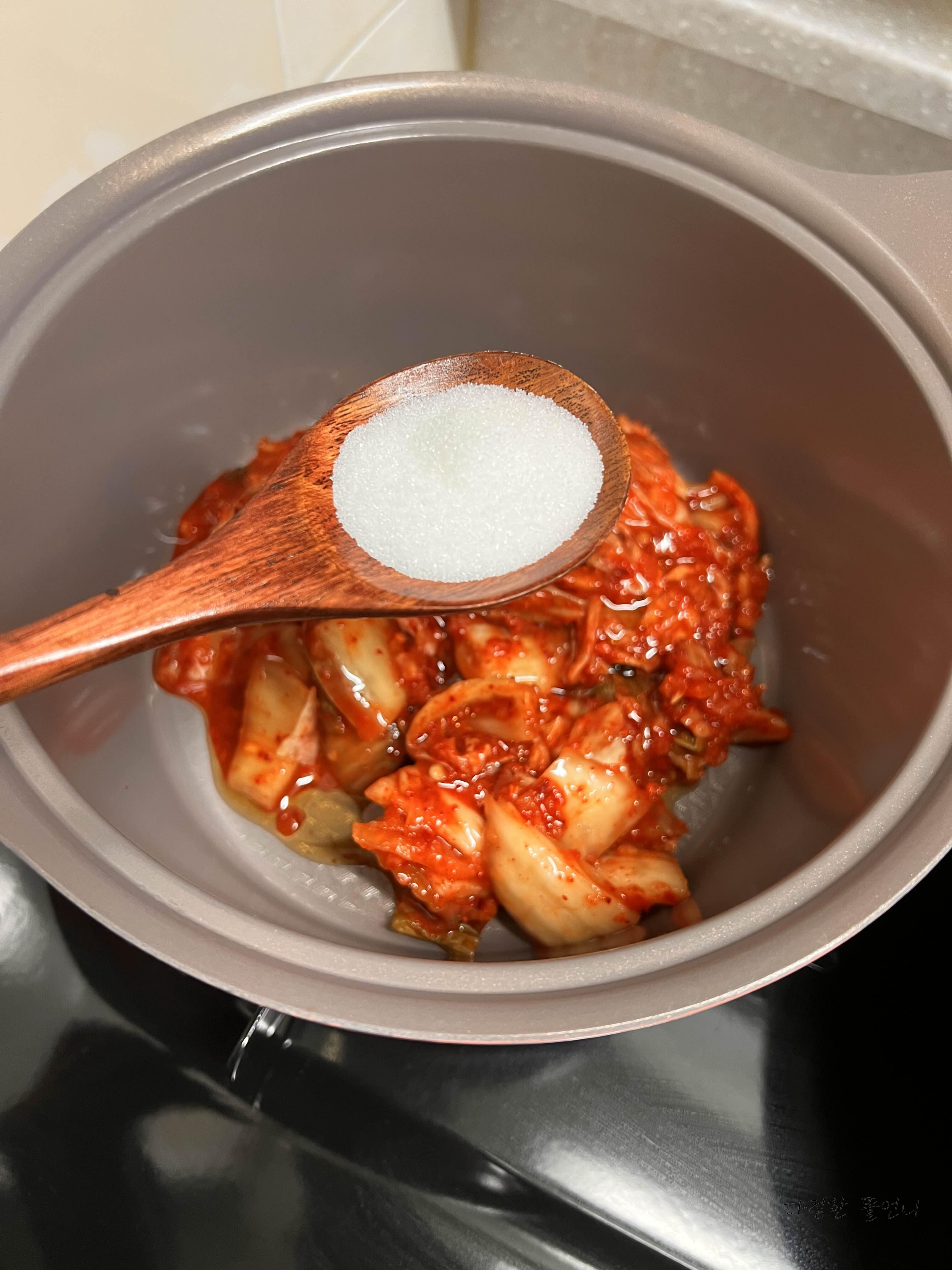 그 물로 찌개 육수를 하기 위해 볶은 김치에 넣어줄거예요