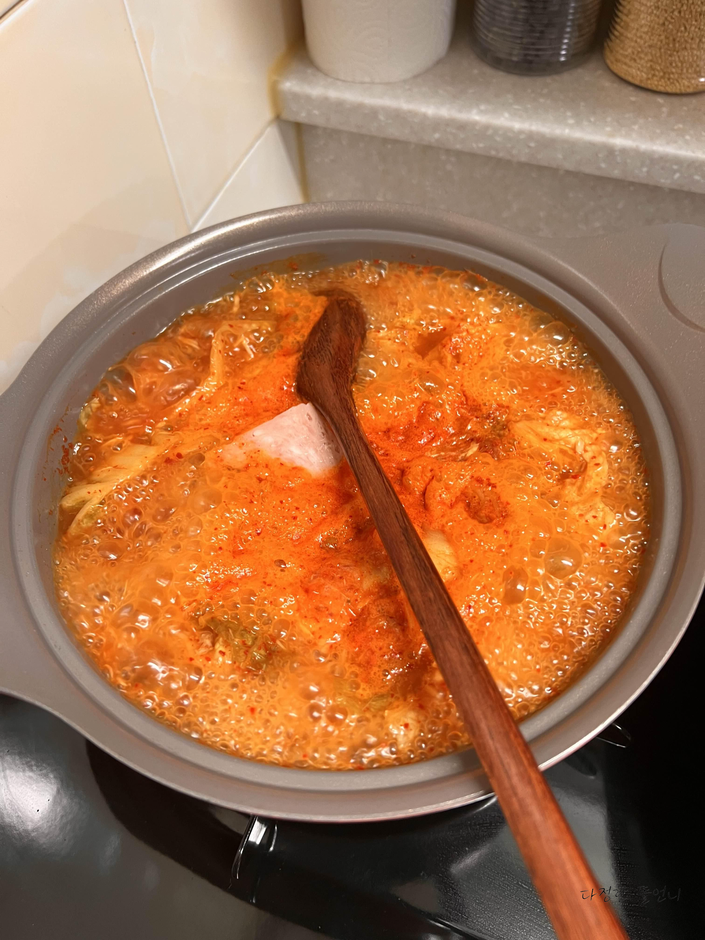 어느정도 김치찌개가 끓기 시작하면 간장 1.5 아빠숟가락을 넣고