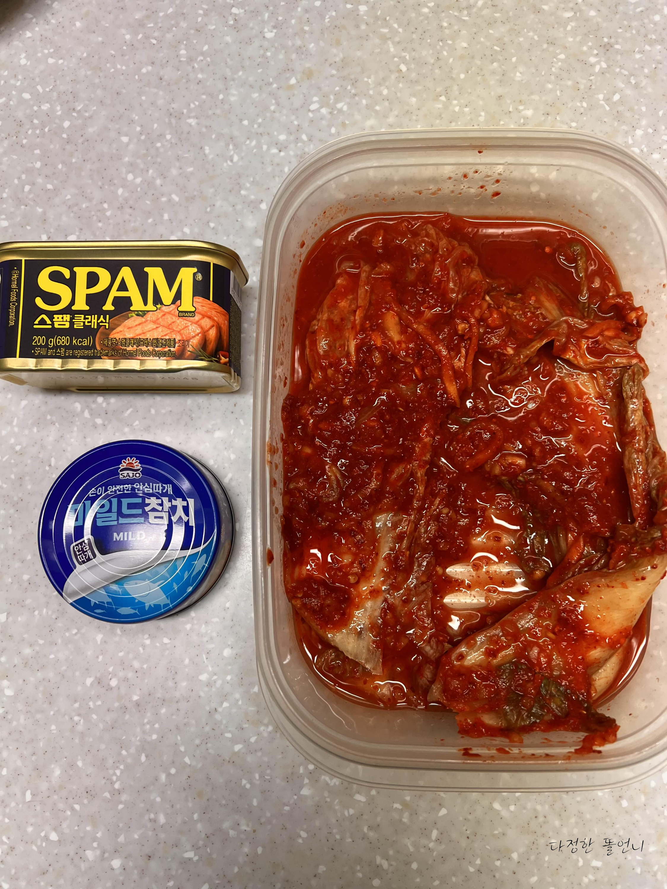 잘 익은 김치, 스팸, 두부, 참치 등 각종 재료들 (저는 두부가 없어서...)