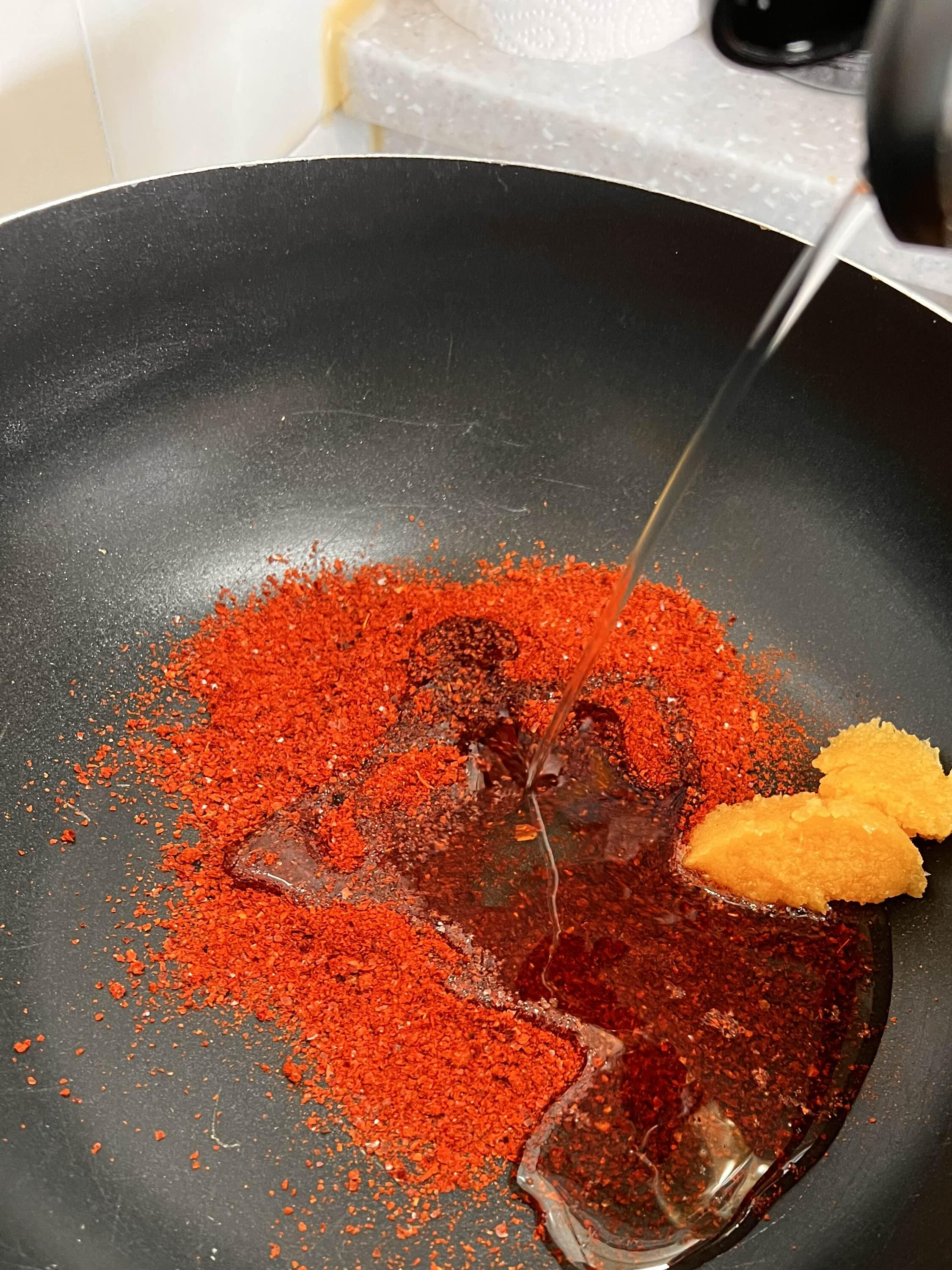 고춧가루 3.5 아빠숟가락, 다져버린마늘 1 큰 아빠숟가락, 식용유 5~6 아빠숟가락