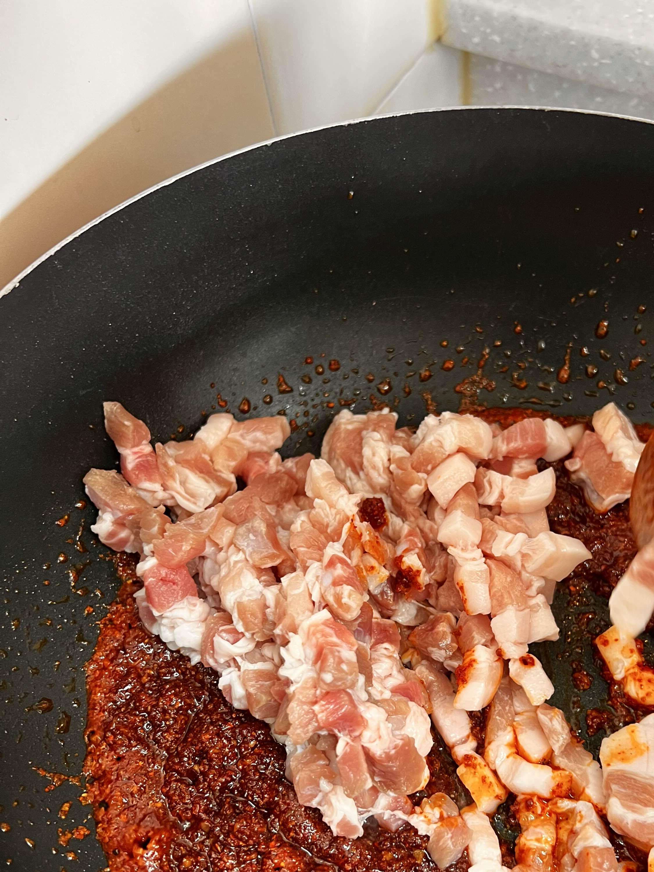 고추기름에 고기를 (그 외의 재료들도) 볶으세요